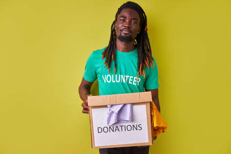 portrait of black afro volunteer man with box full of clothes, young male with dreadlocks engaged in charity, love helping others