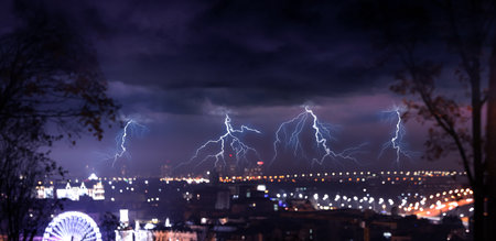 Lightning storm over the city at the summer heavy rain. Dramatic, breathtaking atmospheric natural phenomenon. Kyiv, Ukraine.