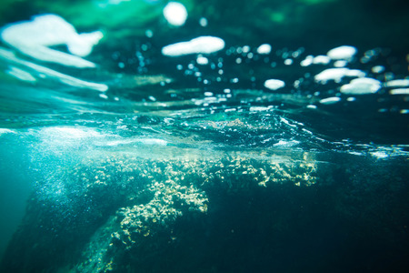 Underwater view of sea water surface with waves and bokeh
