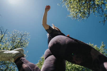 Low-angle view of a person in motion surrounded by nature and vibrant sunlight
