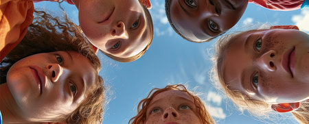 Low angle circle of a cheerful diverse group of people of diverse races an aged looking at camera happy together having fun