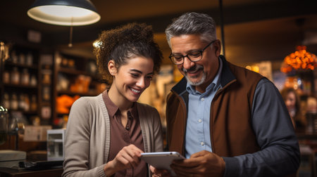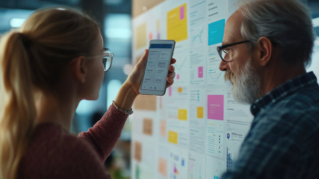 Engaging collaboration between a young woman and an older man as they analyze data on a smartphone against a vibrant presentation board in a modern office.