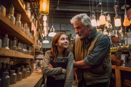 romantic relationship - young woman and older man standing in front of bar, talking and smiling