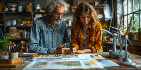 A focused young man and woman engage in a creative brainstorming session, examining materials on a table in a modern workspace. Their expressions reflect concentration and teamwork, highlighting the synergy of collaboration in a vibrant, well-lit environment.