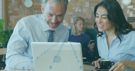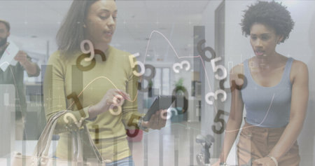 Image of financial data processing with numbers over diverse business people working at office. Global business, finances and digital interface concept digitally generated image.