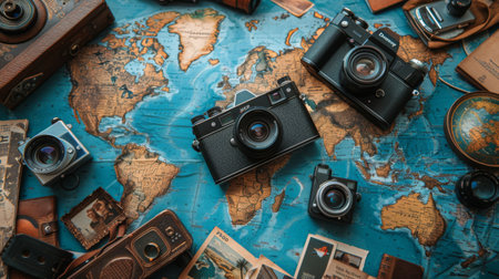 Travel memories captured with cameras on a world map background showcasing various destinations and adventures. Generative AI