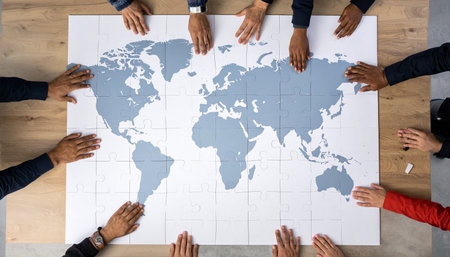 From a top-down perspective, a diverse team of professionals places their hands on a world map, symbolizing a unified approach to global strategy.
