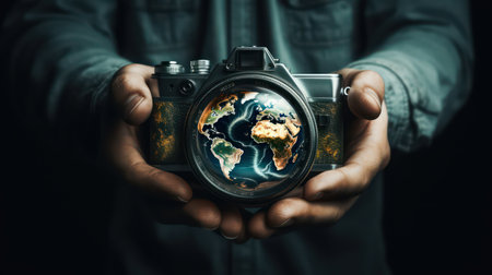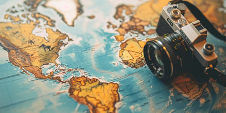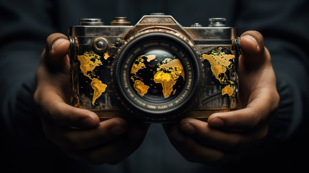 A person holds a camera in front of a vibrant world map, symbolizing the spirit of adventure and exploration. The image captures the essence of travel photography.