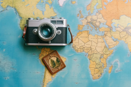 Vintage Camera Resting on Map, Nostalgic Travel Exploration Tool, Top view travel concept with retro camera films, map, and passport on a blue background with copy space, AI Generated