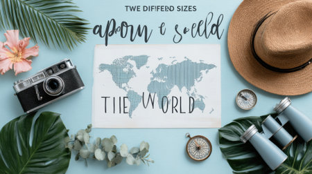 A flat lay composition featuring travel essentials like a hat, camera, and map, evoking a sense of adventure and exploration.