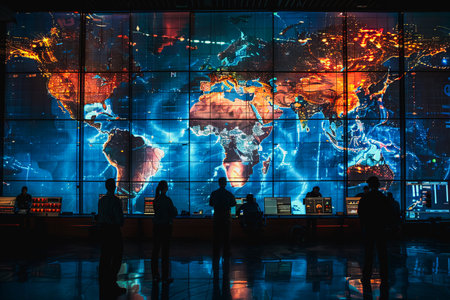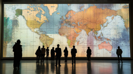 Silhouetted figures stand before a glowing map of the world, symbolizing global connectivity and international relations.