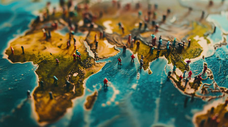 Miniature figures gather around a textured globe, symbolizing global diversity and interconnectedness.
