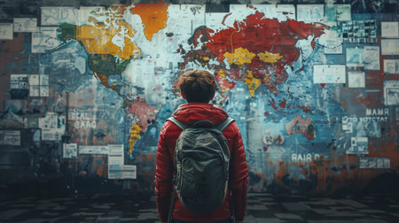 A young traveler in a red jacket stands captivated by a wall-sized world map, plotting future travels or reflecting on past journeys.