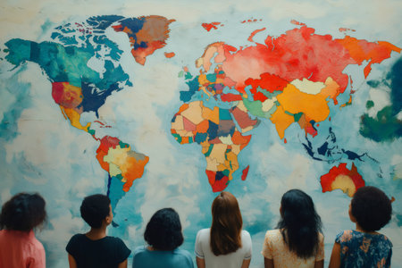 Diverse marketing team planning global strategy looking at a colorful world map painted on a wall