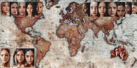 Indoor portrait collage of people of different ages on world map as globalization, society and generations concept