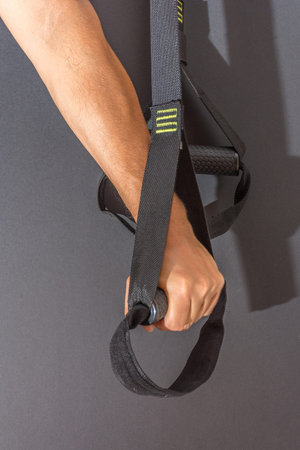 Equipment for myofascial stretching in sport club. Hand and foot leather mounts fixators hanging on crossbar in gym, front view.