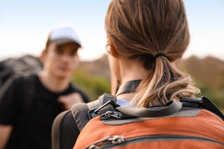 A guy and a girl go hiking on the road, a backpack on his back, hiking equipment for mountaineering, weekends in nature, active life, trekking in the mountains. high quality photo