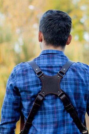 Young handsome man with beard wearing suspenders and posing on dark background.