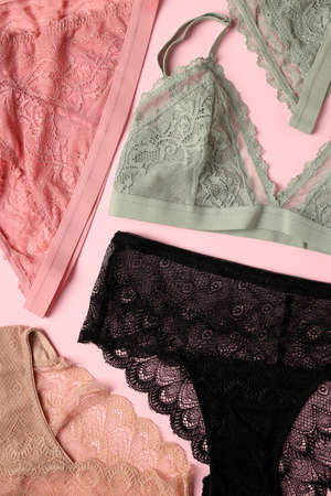 fashionable bra with panties on a pink background with copy space. Women's wardrobe, shopping concept. Underwear.