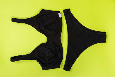 top view of fashionable bra and panties set on green background Female wardrobe, shopping concept. Underwear.