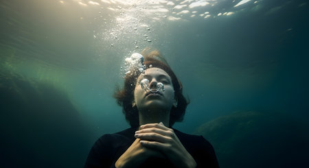 A person with their eyes closed is submerged deep underwater, exhaling a stream of air bubbles that rise towards the surface. Sunlight penetrates the water from above, creating a serene and contemplative atmosphere. The image can represent concepts like tranquility, drowning, anxiety, or rebirth.