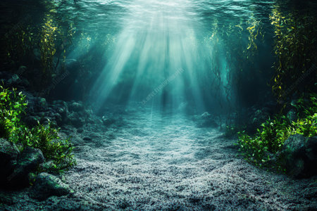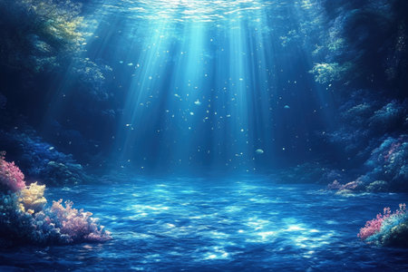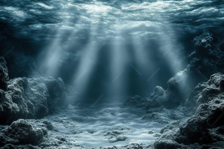 Underwater background with light rays shining through the water surface, creating an ethereal and serene atmosphere for your design projects. The blue color scheme adds depth to the underwater scene. This backdrop is suitable for adding text or other elements in digital art or graphic designs. It can be used as a base layer for underwater scenes, adding realistic details to create stunning visual effects. Digital illustration. High resolution. --v 6.1 Job ID: 51710ca9-9595-4374-886b-71bed1dedf3b