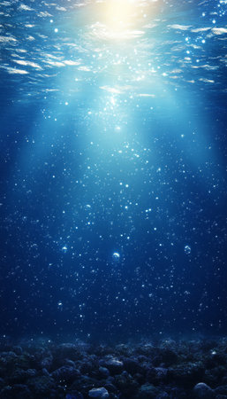 An underwater perspective deep blue water with sunlight filtering from the surface. Tiny bubbles gently float upwards, creating a serene and tranquil scene.