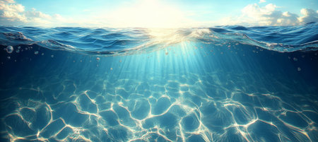 Sunlight streams through the ocean surface, creating shimmering patterns and illuminating the clear blue water below...