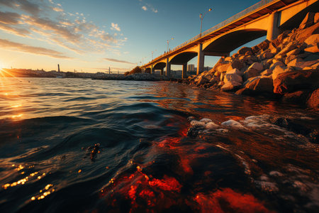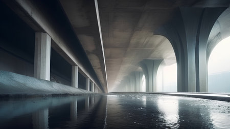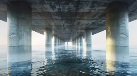 A concrete bridge dominates the composition, extending across tranquil water. The image features a low-angle perspective with dramatic lighting, showcasing textures of concrete and water. The color palette includes shades of blue, orange, and gray, suggesting a dusky environment. Suitable for various commercial and editorial applications.