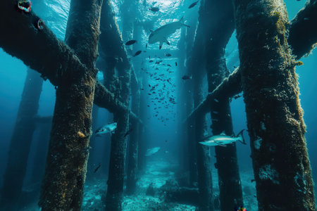 This stunning underwater image captures the rusted pillars of an oil platform, showcasing marine life thriving in the clear blue water, highlighting industrial structures and nature.