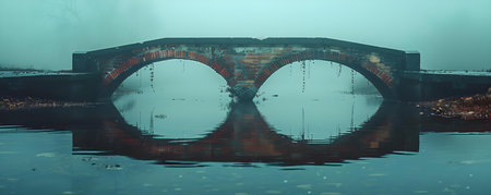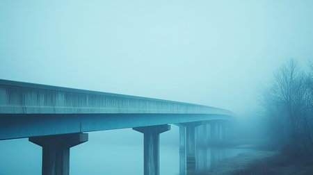 A serene and tranquil landscape featuring a bridge enveloped in mist, reflecting on calm water under soft blue tones, perfect for evoking peace.