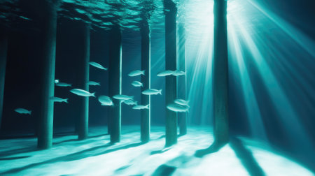 Underwater Pier with Swirling Fish and Radiant Sunbeams