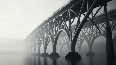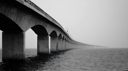 A long concrete bridge stretches across water in a monochromatic scene. The composition highlights the bridge's arches and length. The image features a foggy, overcast sky creating a somber atmosphere. Suitable for editorial and commercial use, this image could illustrate infrastructure or travel.