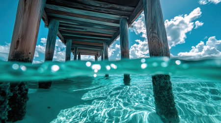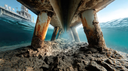 This striking underwater image captures a pier's rusted supports, revealing the serene marine environment. The clear water enhances the natural beauty.