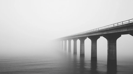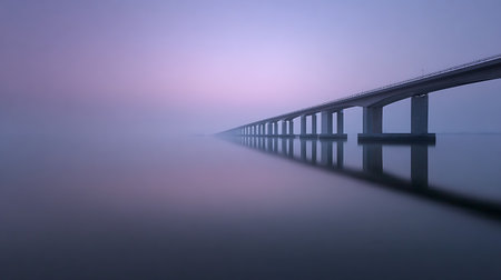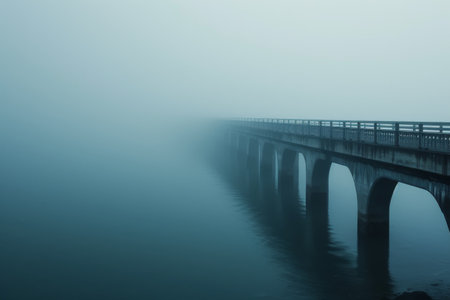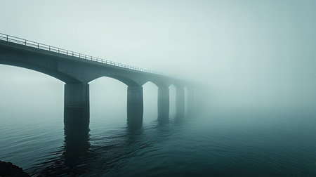 Long exposure shot showcasing a concrete bridge disappearing into the fog, with its reflection softly mirrored in the still water below, creating a serene and minimalist landscape.