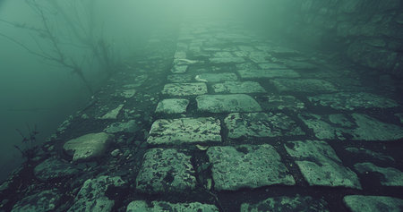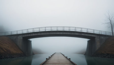 Misty bridge spanning across a dark body of water, creating a mysterious atmosphere.