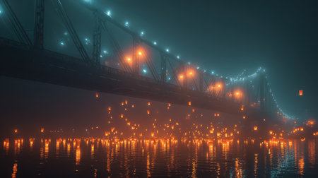 A mystical bridge connects glowing lanterns in thick fog creating a serene atmosphere as people celebrate the New Year together in harmony.