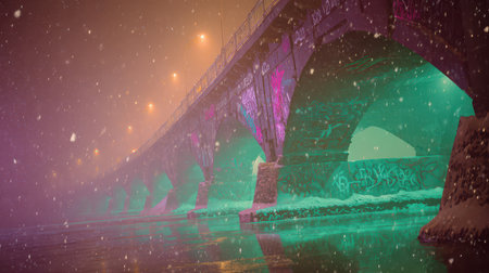 Under a blanket of softly falling snow a bridge radiates mystical sigils illuminating the chilly night as New Year celebrations begin.