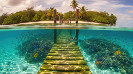 A stunning visual capturing a modern bridge spanning over crystal clear turquoise waters. The scene showcases the beauty of nature and architecture under a vibrant sky.