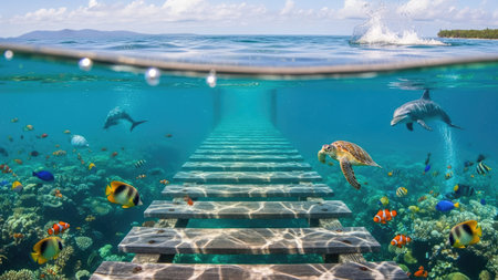 Underwater view of a wooden bridge leading to the sea. 3d rendering