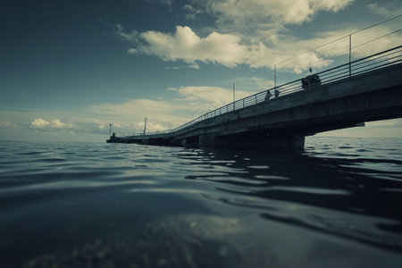 Scenic sea landscape featuring a long bridge reaching out to the horizon, symbolizing connection and distance.