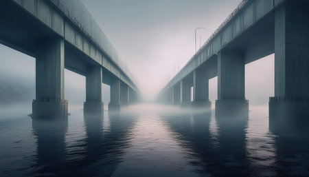 Two towering bridges loom over calm waters, shrouded in thick fog, adding mystery.