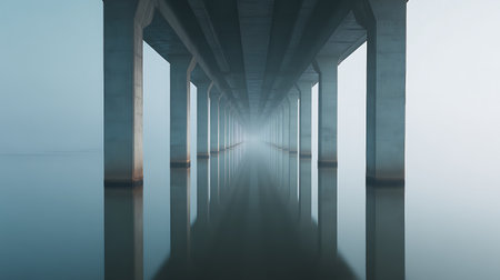 A view of bridge pillars meeting still water in soft light, reflected to create a symmetrical composition, emphasizing depth, stillness, and a serene atmosphere.