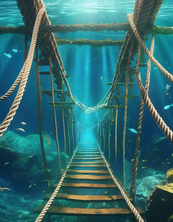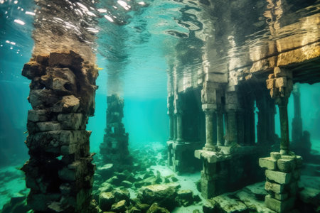 Ethereal underwater ruins with ancient bridges covered in vibrant marine life,a captivating fusion of natural beauty and historic architecture,inviting and discovery.