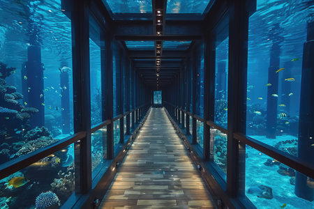 Wooden walkway through a mesmerizing underwater tunnel with diverse marine life