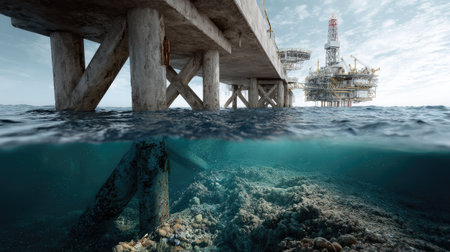 A captivating scene depicting an offshore oil rig submerged partially in water, revealing underwater columns and a vibrant ecosystem teeming with coral and marine life.