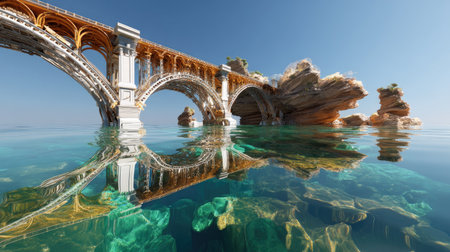 This breathtaking image showcases a stunning architectural bridge soaring over crystal clear water, surrounded by unique rock formations, reflecting vibrant colors.