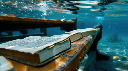 A captivating underwater scene featuring several opened books resting on a wooden table, surrounded by vibrant marine life and vivid blue water.