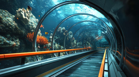 Explore a stunning underwater tunnel showcasing vibrant coral reefs and diverse fish species, providing an immersive experience of marine ecosystems and breathtaking views.