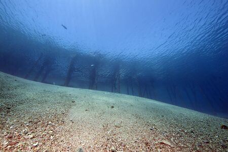 Floating bridge over transparent sea water showing sandy seabed and marine life below